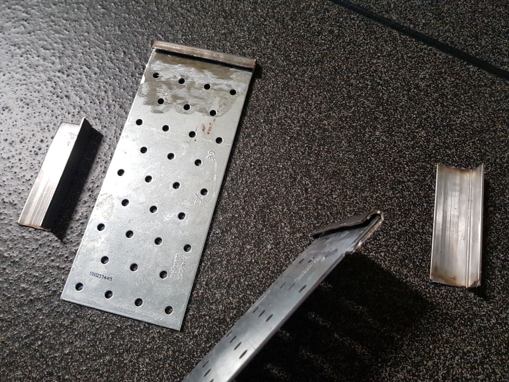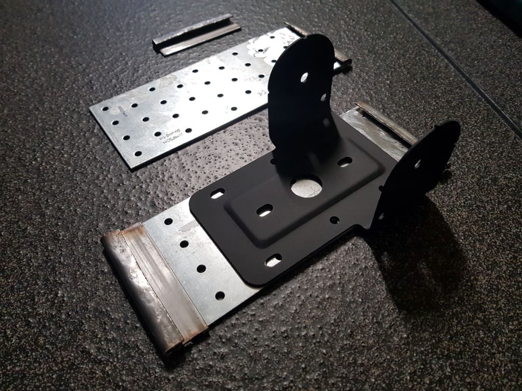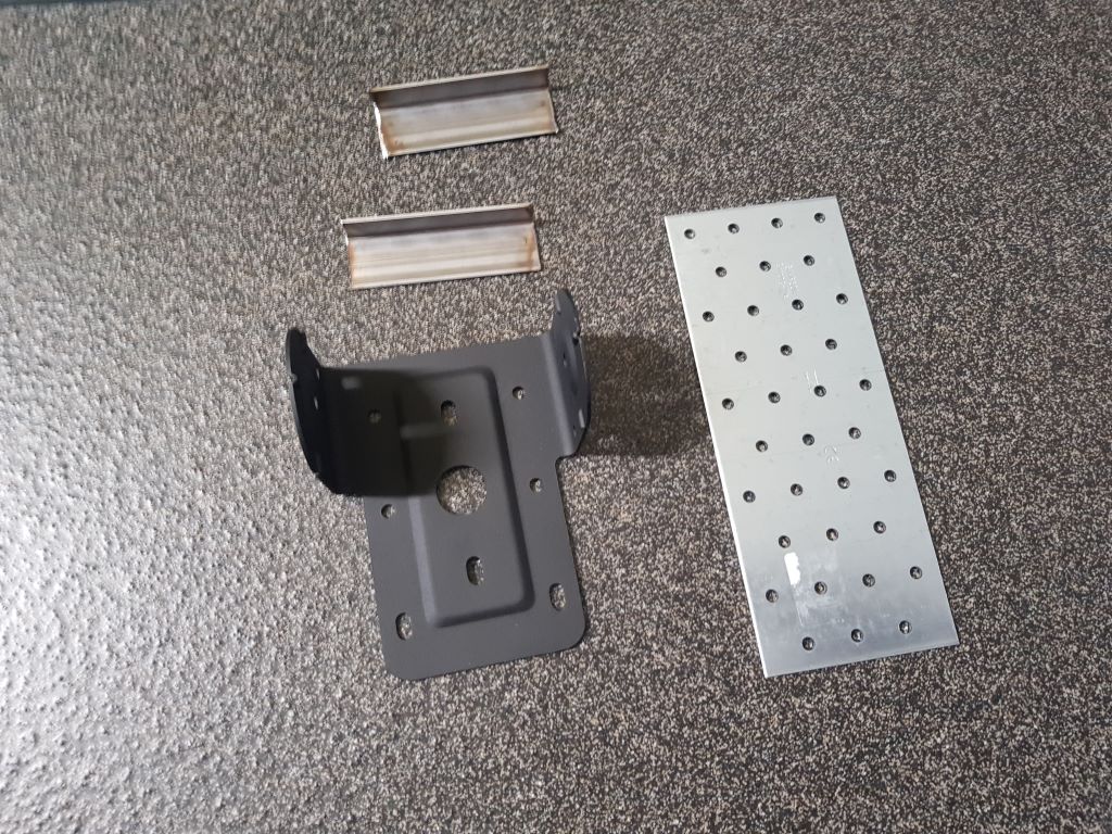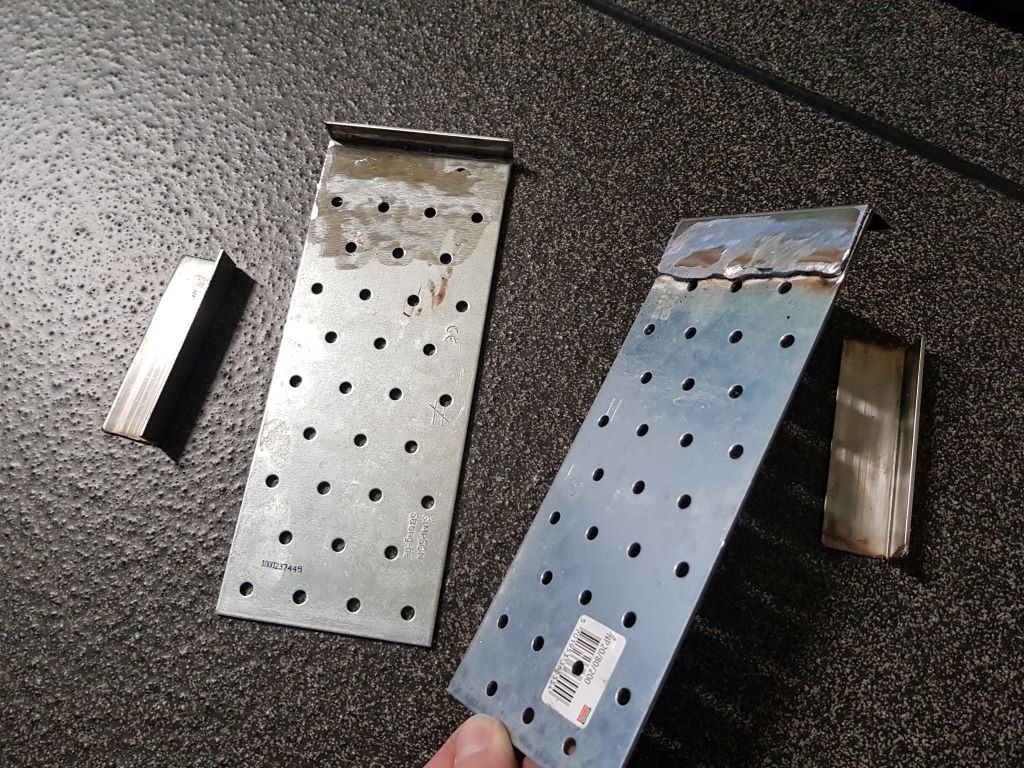 Für die Halterung habe ich mir 2 Lochbleche aus dem Dachstuhlhandwerk sowie ein Winkelblech organisiert. Das Winkelblech wird so gebogen das ich es oben und unten am Lochblech fixiert als Klemme verwenden kann. Die Lautsprecherhalterung (Lieferumfang), das Lochblech und die Winkel werden dann passend verschweißt und danach lackiert.