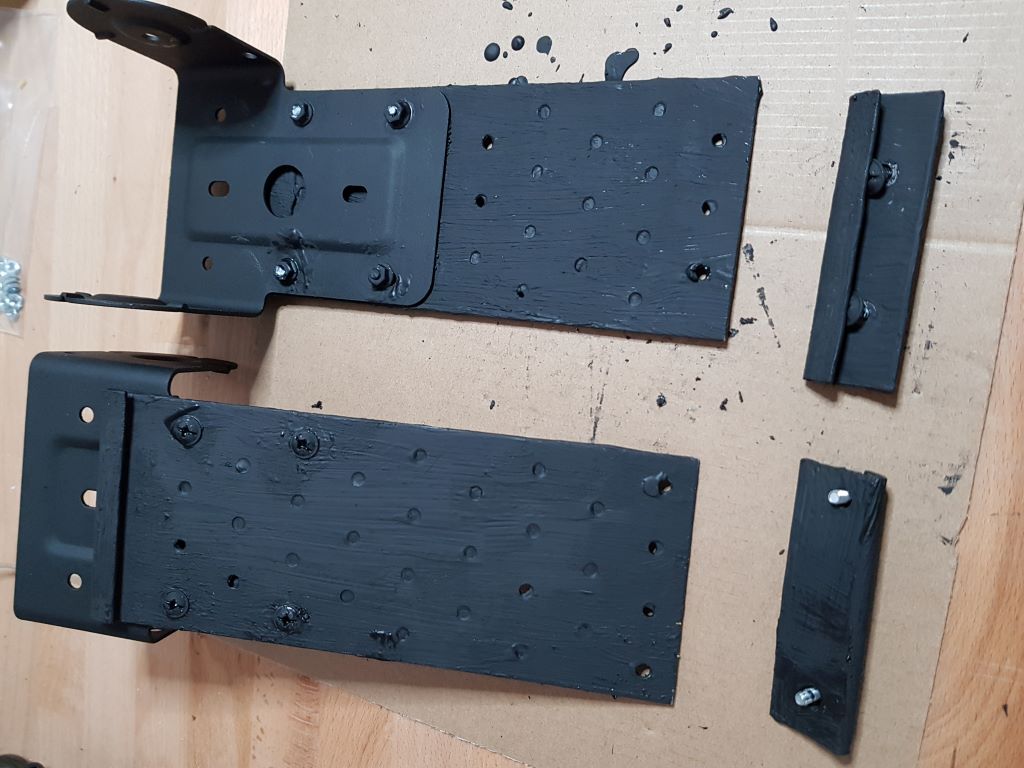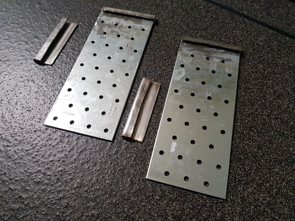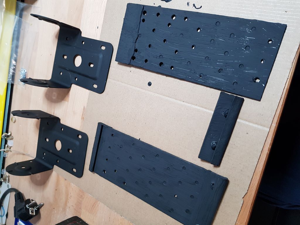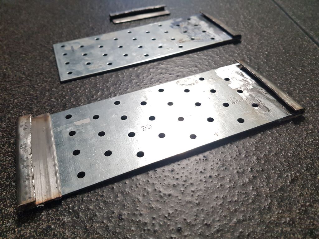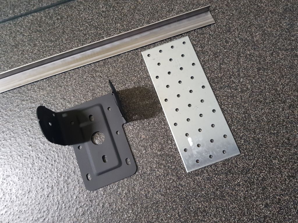 Für die Halterung habe ich mir 2 Lochbleche aus dem Dachstuhlhandwerk sowie ein Winkelblech organisiert. Das Winkelblech wird so gebogen das ich es oben und unten am Lochblech fixiert als Klemme verwenden kann. Die Lautsprecherhalterung (Lieferumfang), das Lochblech und die Winkel werden dann passend verschweißt und danach lackiert.