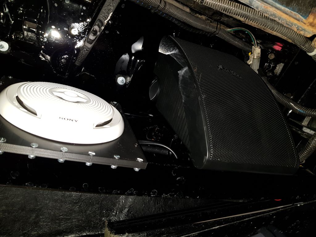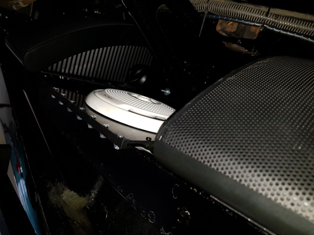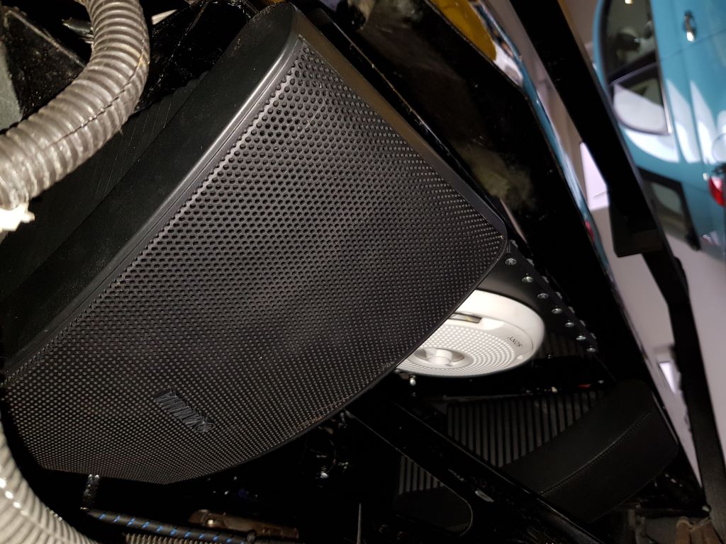 Nun kann ich die Halterung und danach die Lautsprecher positionieren und fixieren. Die Verkabelung isz hinter dem Lautsprecher versteckt im Träger und kann durch die verbleibende Schwenkbarkeit der Lautsprecherhalterung zugängig gemacht werden.... und der Sound,... KRAFTVOLL und LAUT. :)