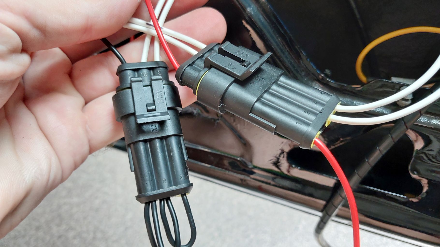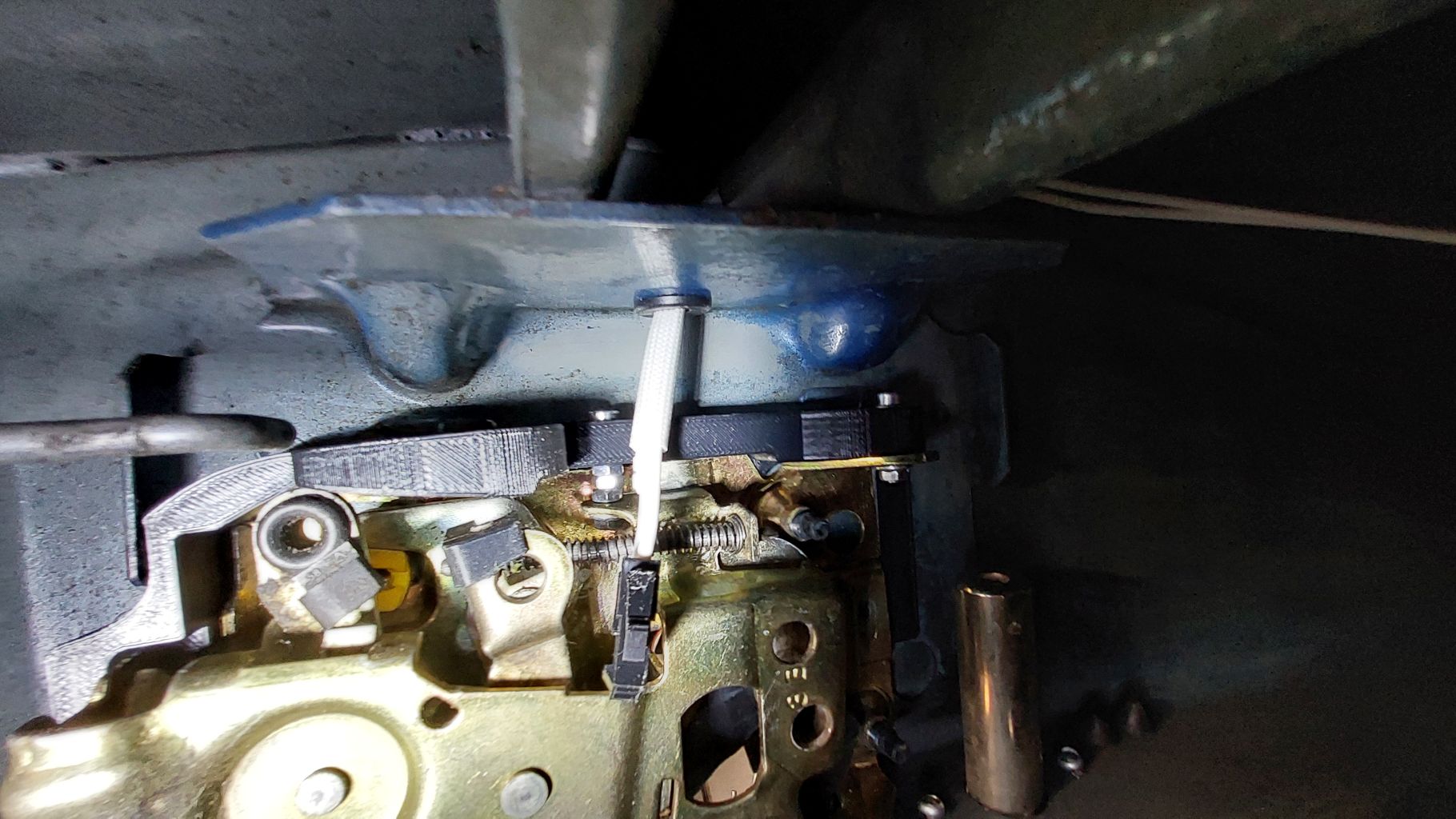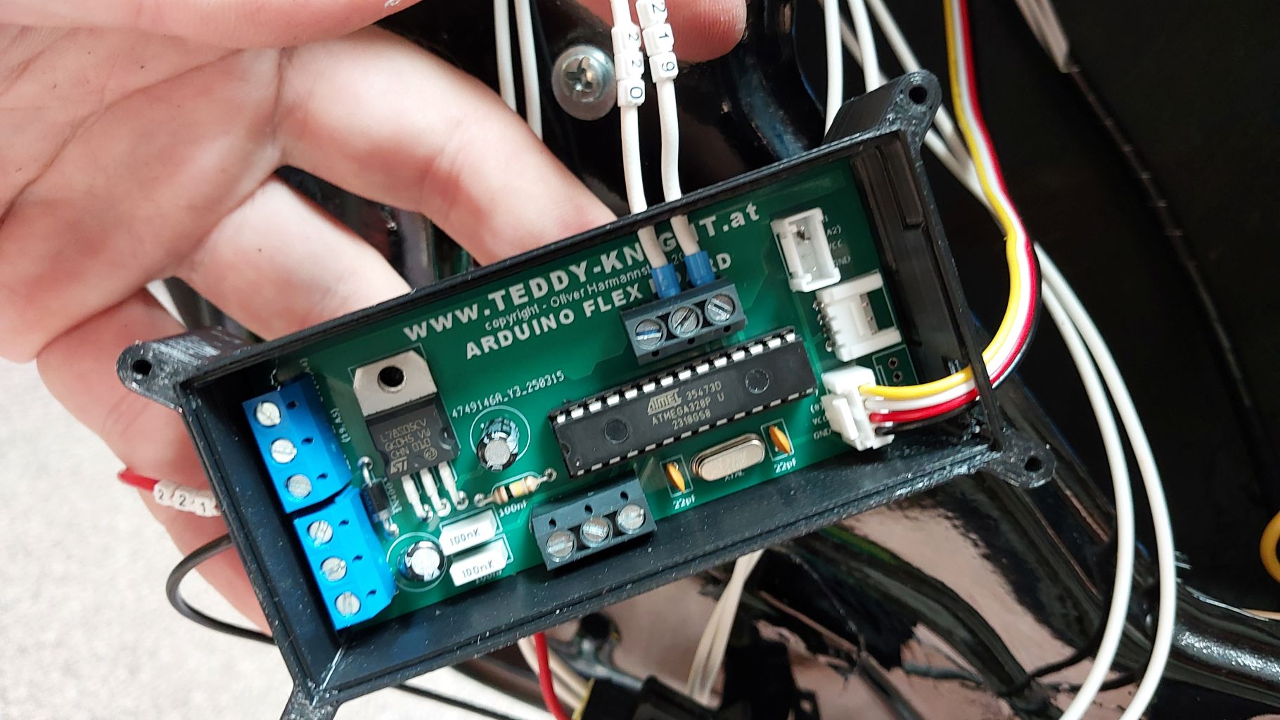 Der offensichtlich beste Ort für die Montage des Elektronikgehäuses ergibt sich für mich an einer Strebe (Versteifungsstrebe für einen möglichen Seitencrash), welche zudem nahe an der Türschlossmechanik verläuft. Das ermöglicht kurze Kabelstrecken zum Schloss und zu den LEDs. Die Kabeln für die Stromversorgung verlaufen bis in den Sicherungskasten im Fahrerfussraum.