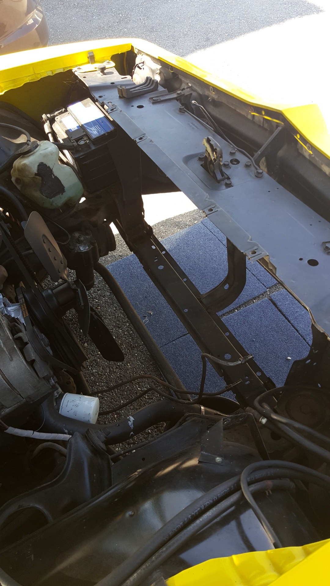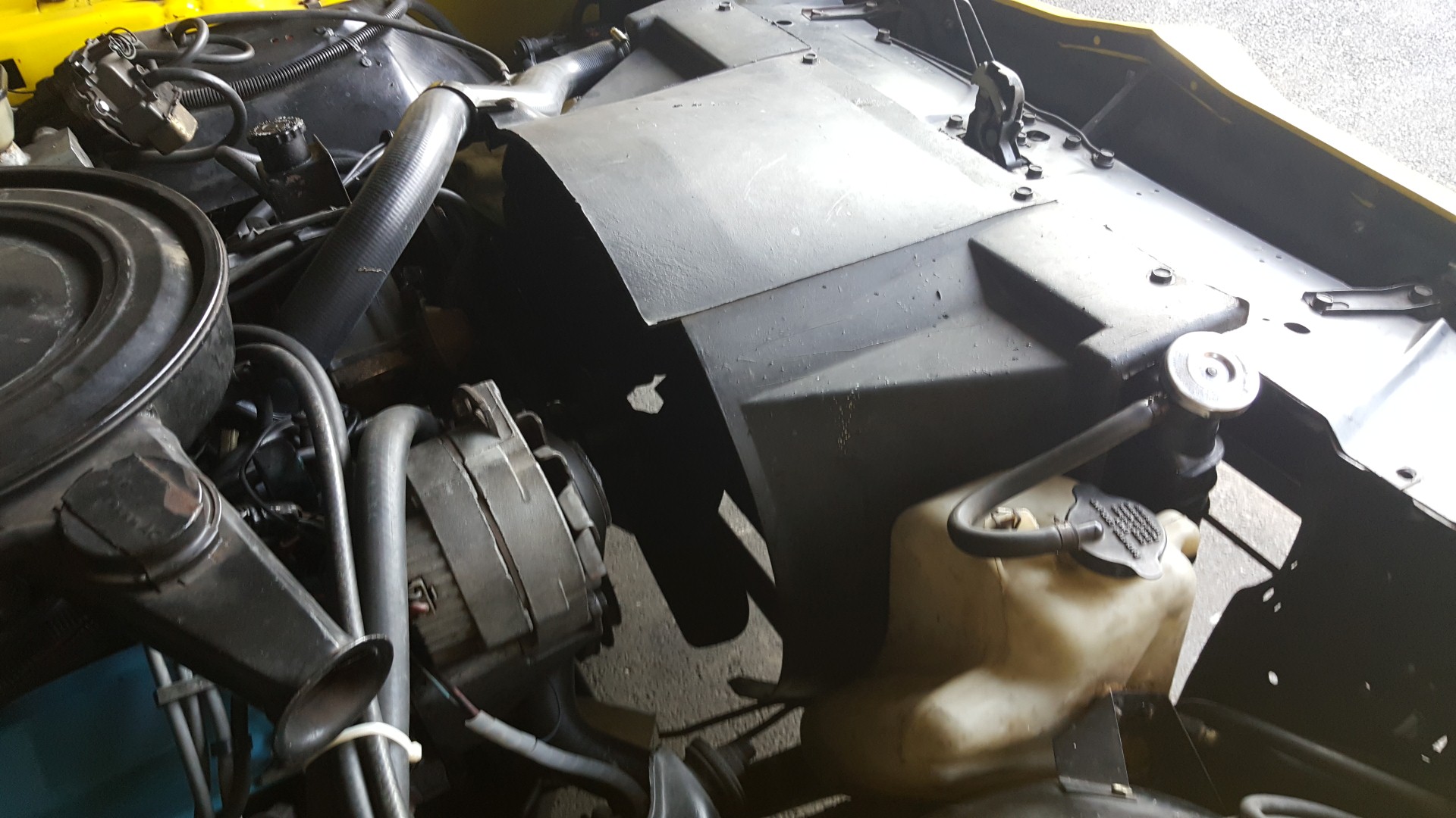 Allen Anfang macht das Leeren des Kühlsystems, was zeigt das im Motor alles im Reinen sein dürfte. Die Flüssigkeit sieht aus wie neu. Danach werden die Schläuche des Wasser und Ölkreislaufes abgeklemmt. Es folgt der Ausbau des Gebläsetunnels und des Kühlers. Der Gebläsetunnel selbst hat auch schon etwas Rost angesetzt, was wir auch umgehend konserviert haben.