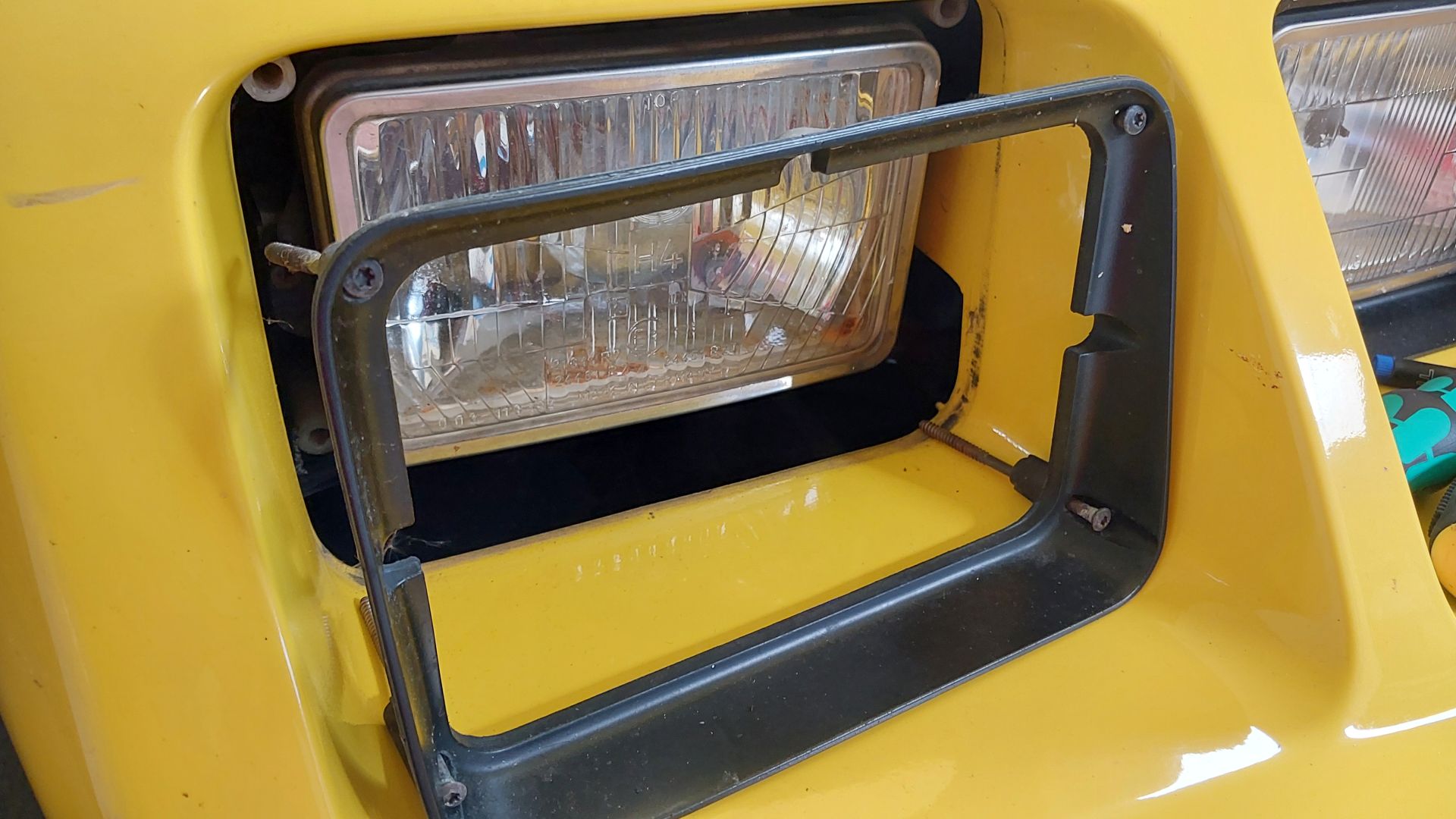 - Demontage des Chromrahmens - 4 Kreuzschrauben oberhalb und unterhalb des Chromrahmens - danach kann der Chromrahmen abgezogen werden und der Scheinwerfer liegt nun nurmehr in seiner Halterung.